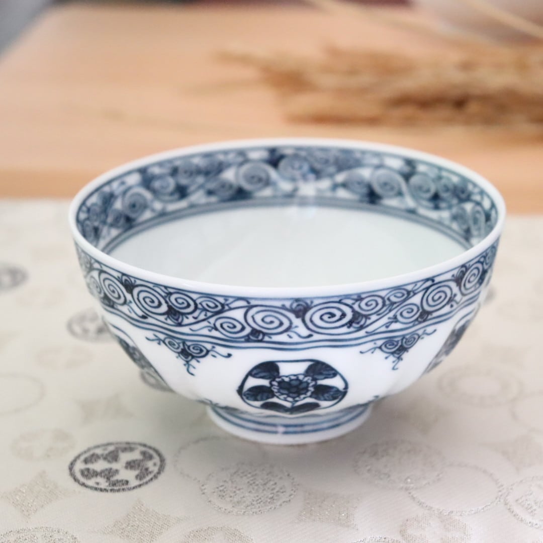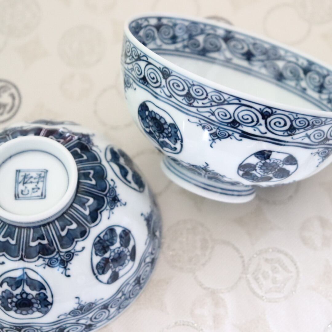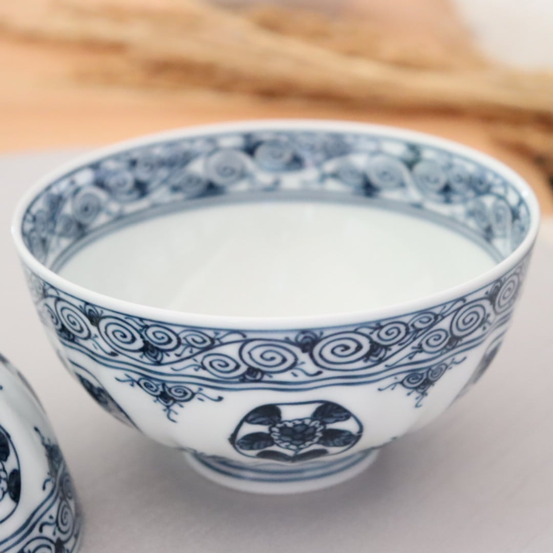 女性に人気の絵柄で6個の丸紋の中に2種類の花を描いてます。縁には渦を巻いたような唐草紋様。写真ではわかりにくいですが、飯碗の表面には少しだけ凹凸を付けているのでその手触り感があります。