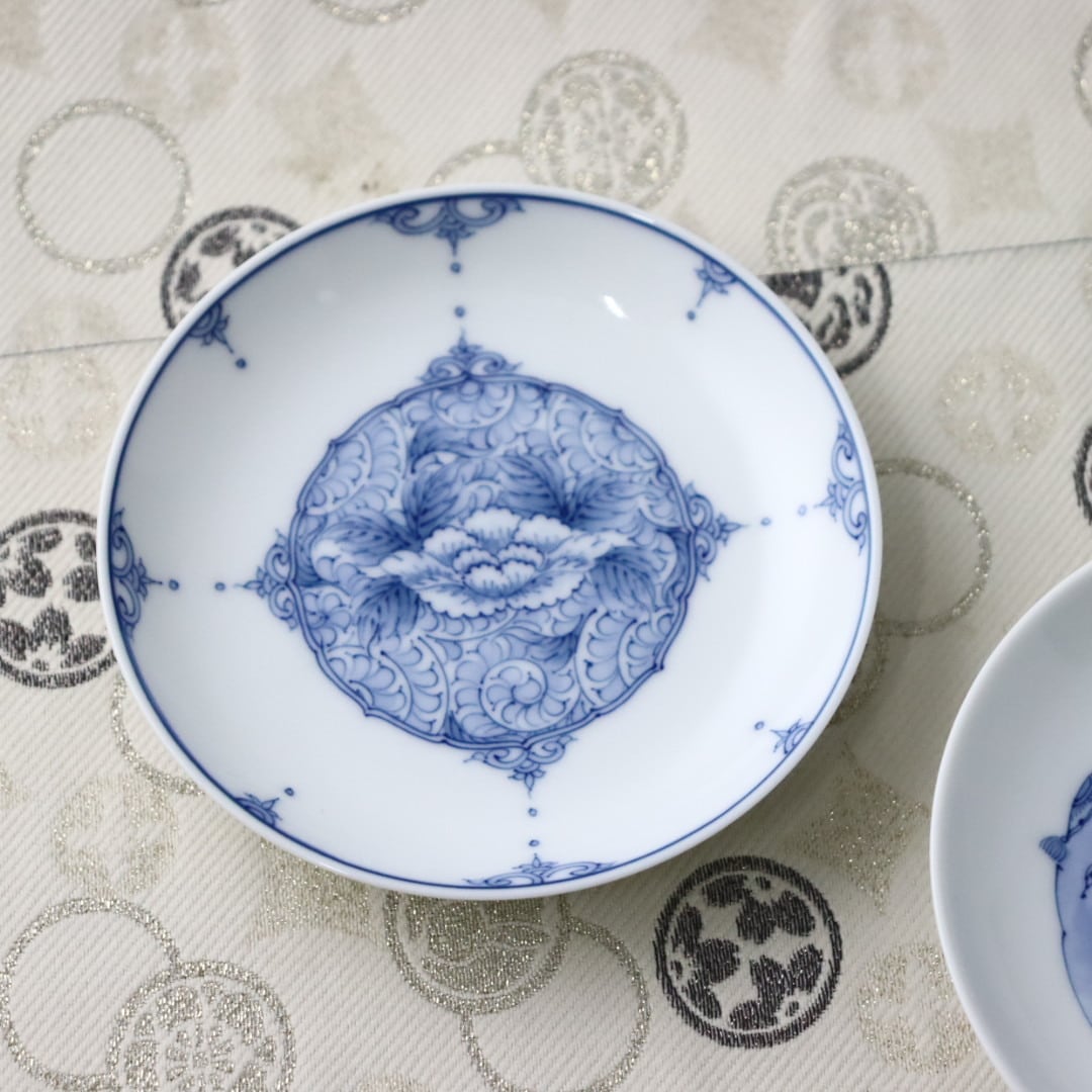 すべて筆による手描きで、手に取っていただくと三川内焼らしい薄さ軽さを感じて頂けると思います。牡丹の花と唐草を磁器の余白の白を生かしながら描いています。天草陶石の美しさをお伝えいたします。