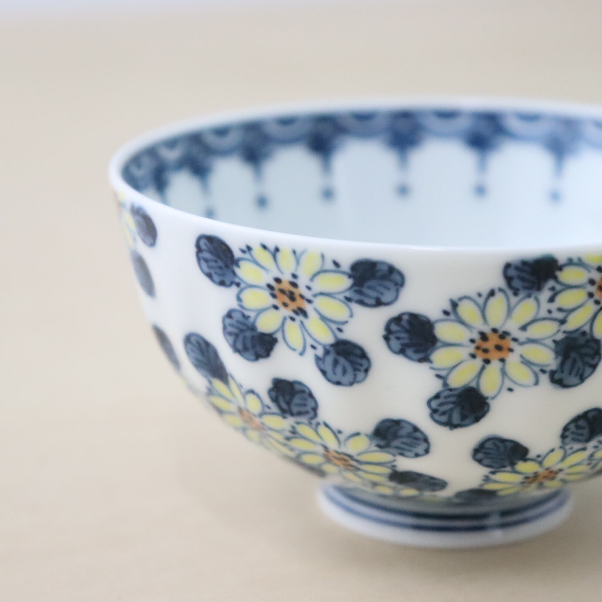 黄小花・魚紋の人気柄をご用意させて頂きました。うつわの外側は凸凹と縦に筋が入り安定感があり滑りにくいとご好評頂いております。